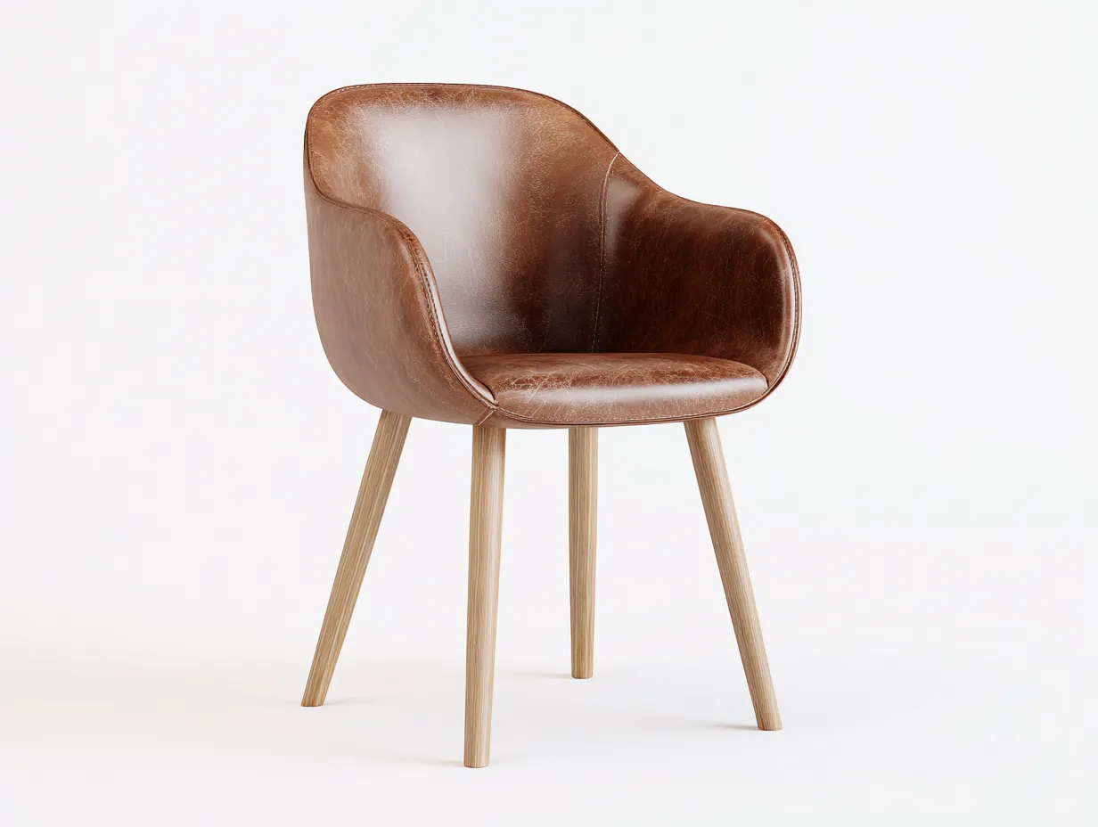 Der Stuhl besteht aus Kunstleder und Holz in Braun. Die Oberfläche zeigt eine dezente Struktur mit natürlicher Anmutung, während die hellen Holzbeine eine stabile Basis bieten und den nordischen Stil unterstreichen. Die Verarbeitung ist auf eine zuverlässige Nutzung ausgelegt.
