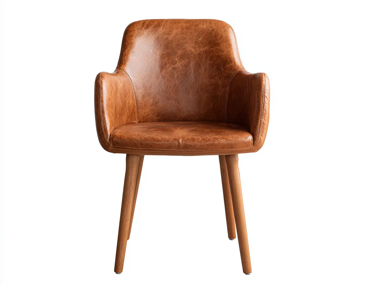 Gefertigt aus Kunstleder und Holz in Braun, bietet der Stuhl eine strukturierte Oberfläche mit charaktervoller Optik. Die stabilen Holzbeine gewährleisten eine sichere Standfestigkeit, während die solide Verarbeitung auf langfristige Nutzung ausgelegt ist.