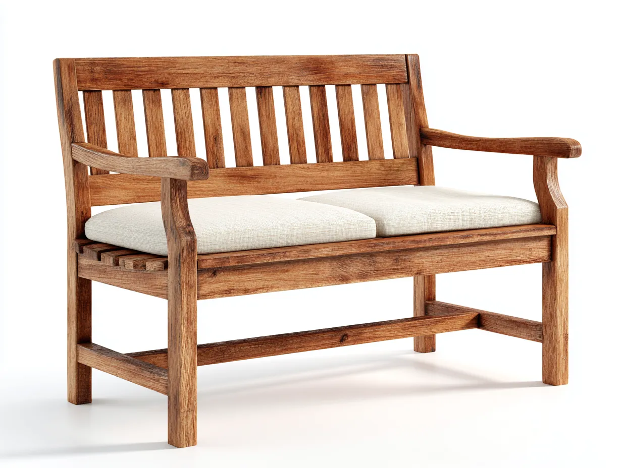 Die Gartenbank ist aus Holz gefertigt und mit Stoffkissen ausgestattet. Die Oberfläche präsentiert sich in einem natürlichen Holzton, ergänzt durch Sitzflächen in heller Beigeoptik. Die sichtbare Holzmaserung unterstreicht den authentischen Charakter, während die stabile Konstruktion für Zuverlässigkeit im täglichen Gebrauch sorgt.