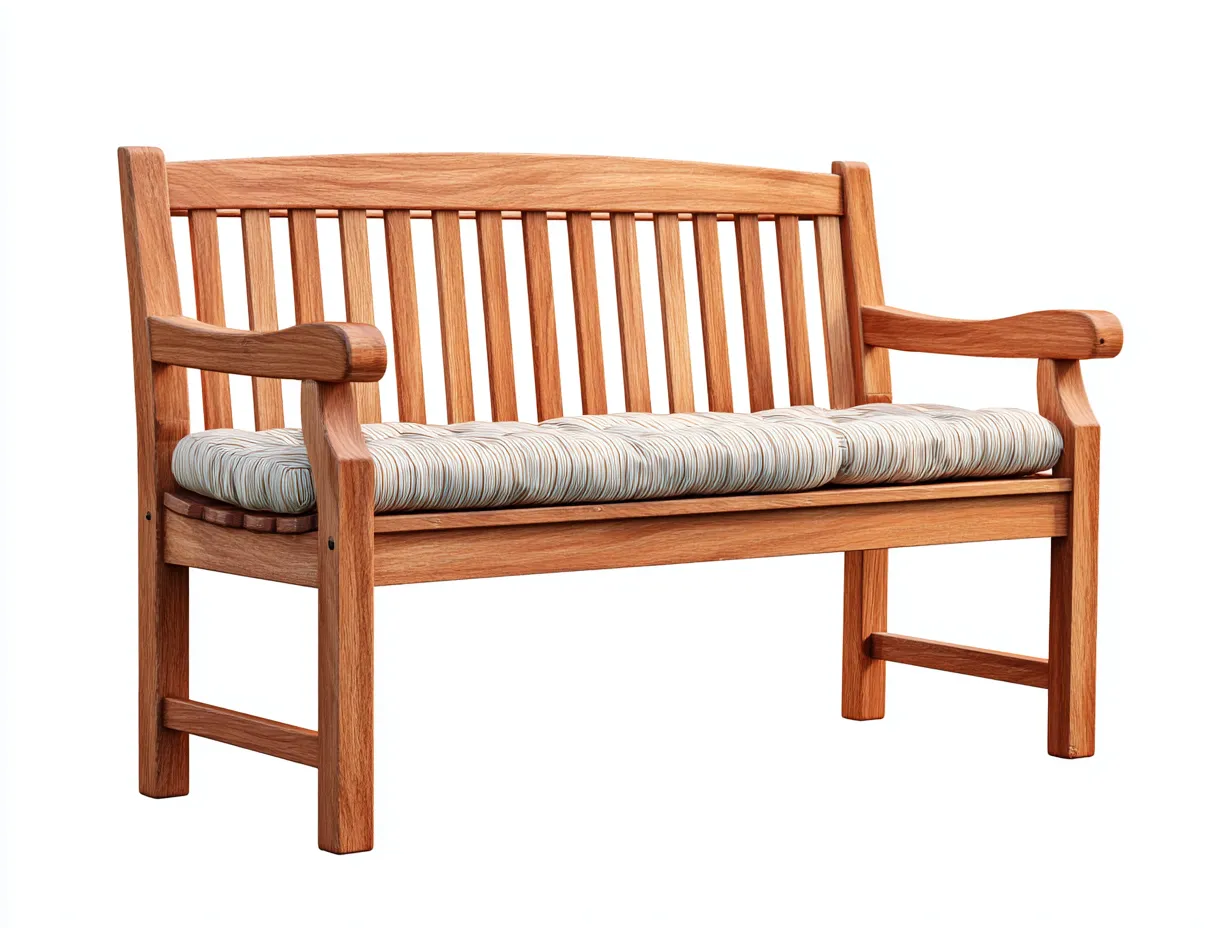 Die Bank ist aus Holz gefertigt und mit einer textilen Sitzauflage ergänzt. Die Oberfläche zeigt einen warmen Holzfarbton, während die Sitzfläche in einer dezenten, ruhigen Textiloptik gehalten ist. Die stabile Konstruktion unterstützt eine zuverlässige Nutzung im Alltag.