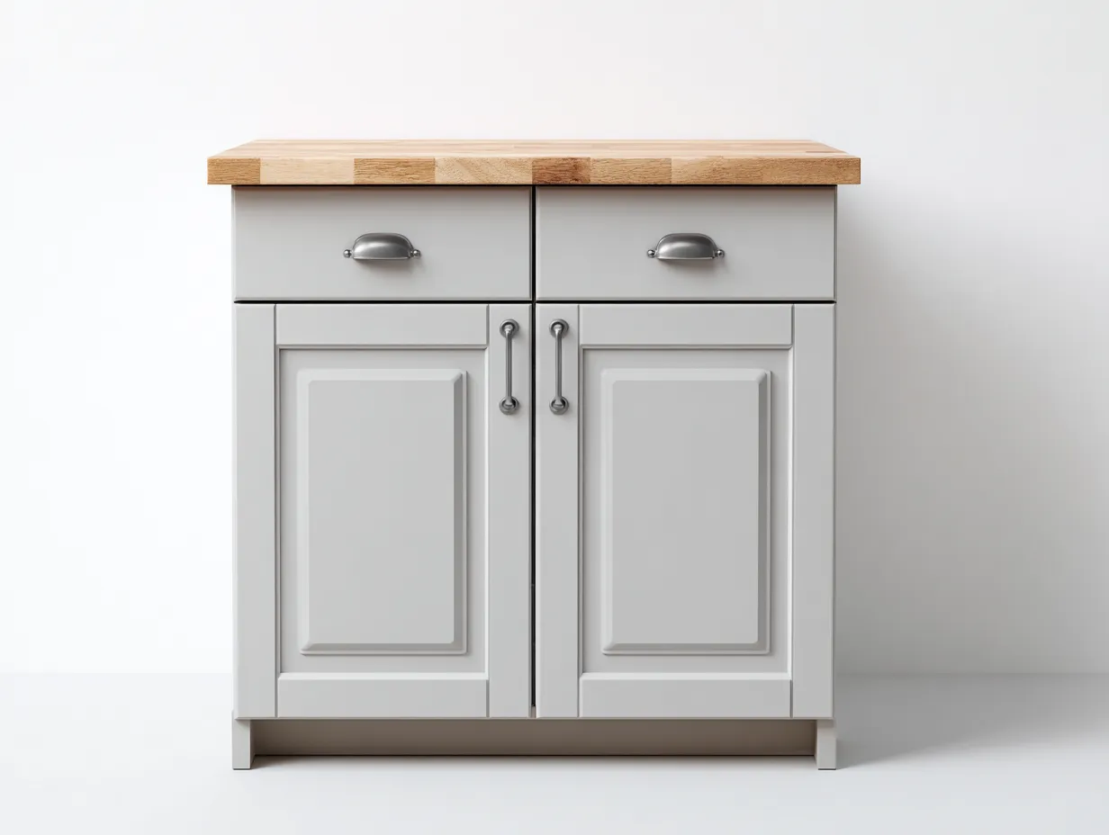 Gefertigt aus Holzwerkstoff und Metall bietet das Möbelstück eine stabile Konstruktion. Der Korpus ist in Weiß gehalten, die obere Platte zeigt eine natürliche Holzoptik. Die Oberflächen sind gleichmäßig verarbeitet und pflegeleicht im täglichen Gebrauch. Metallgriffe ergänzen das Gesamtbild funktional und optisch.