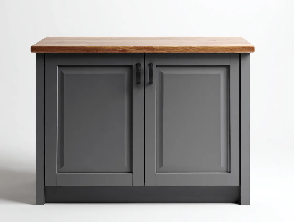 Gefertigt aus Holzwerkstoff und Metall bietet das Möbelstück eine stabile und langlebige Konstruktion. Der Korpus ist in Grau gehalten, während die obere Platte in Naturholzoptik gestaltet ist. Die Oberflächen sind pflegeleicht und alltagstauglich verarbeitet.
