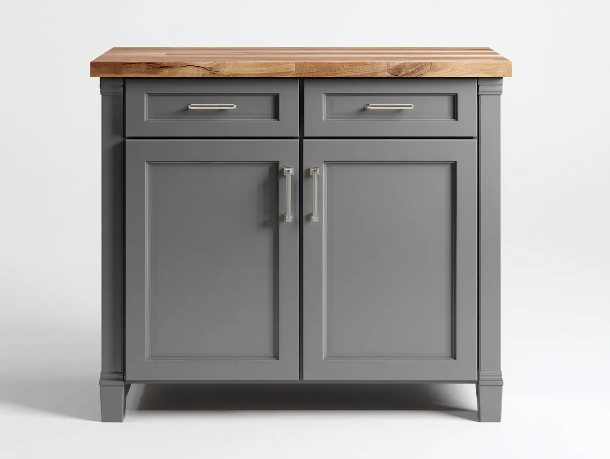 Gefertigt aus Holzwerkstoff und Metall überzeugt das Möbelstück durch Stabilität und Alltagstauglichkeit. Der Korpus ist in Grau gehalten, während die obere Platte in Naturholzoptik ausgeführt ist. Die Oberflächen sind gleichmäßig verarbeitet und leicht zu reinigen. Metallgriffe runden das Erscheinungsbild ab.